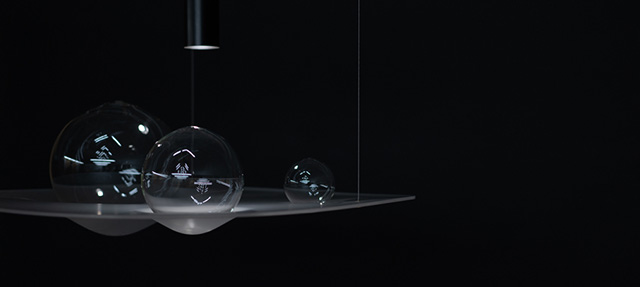 A hand blown glass and formed acrylic chandelier inspired by visualization models of the gravitational effects by celestial bodies in space. Limited Edition of 20 pieces available in clear glass (A), clear & frosted combination (B) and all frosted glass (C). Free shipping is available for this piece.