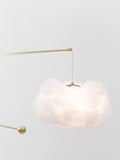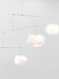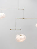 Equal parts art object and functional lamp, this piece uses dynamic movement itself as a design material: the clouds, delicately cantilevered on brass arms, literally float, suspended in mid-air as the parts move gently in subtle indoor air currents.